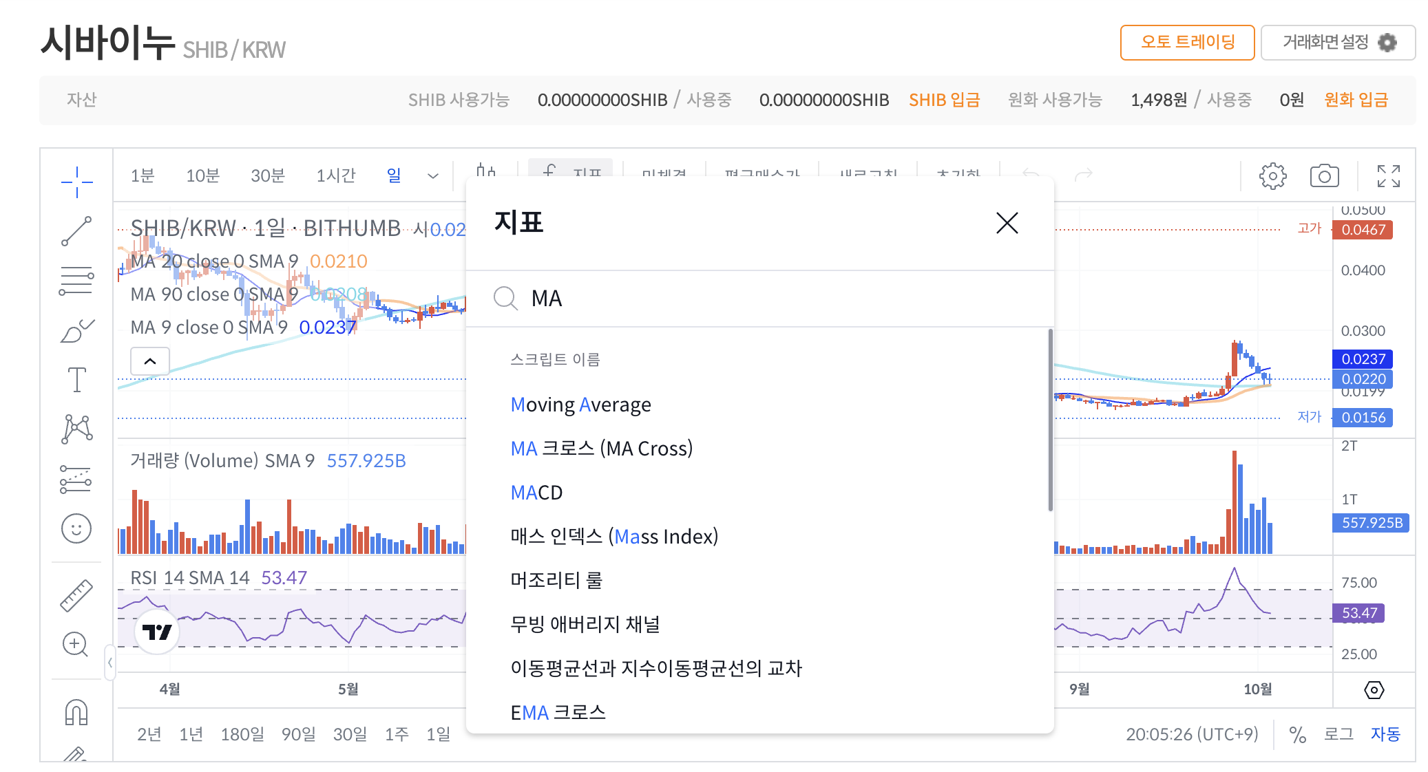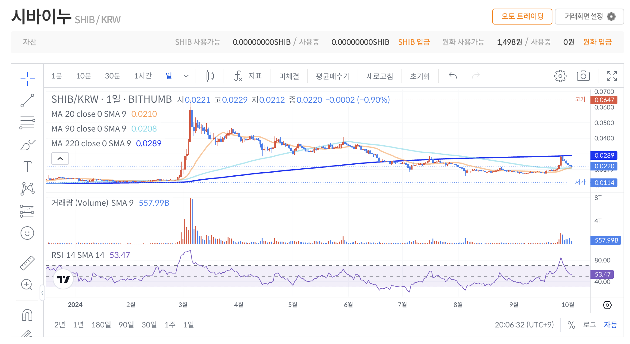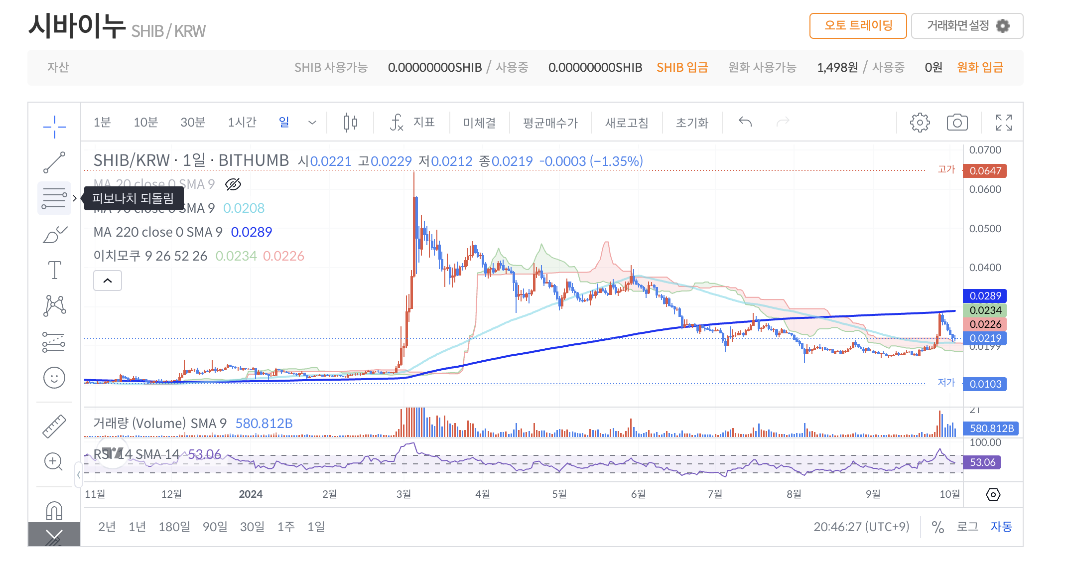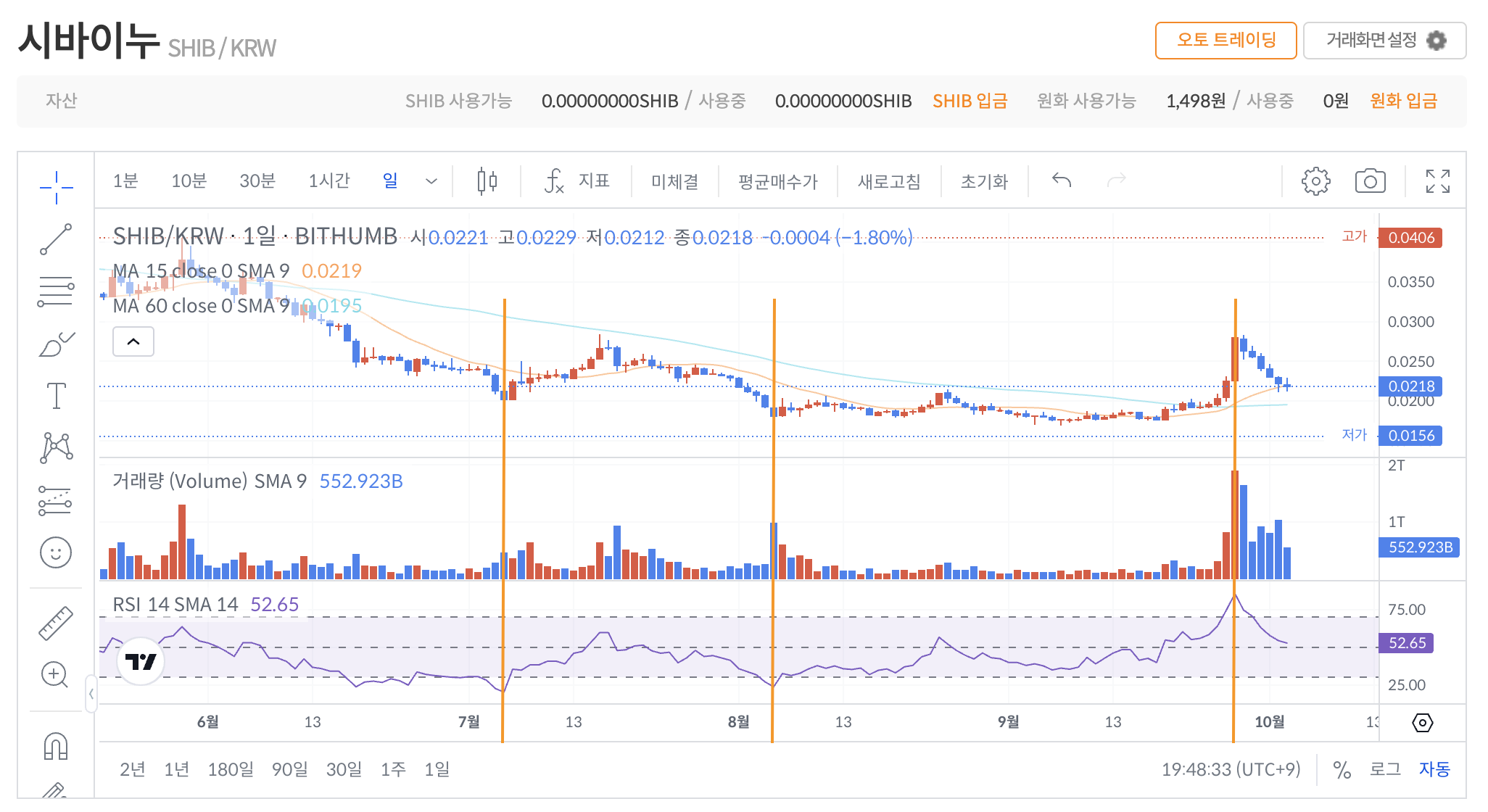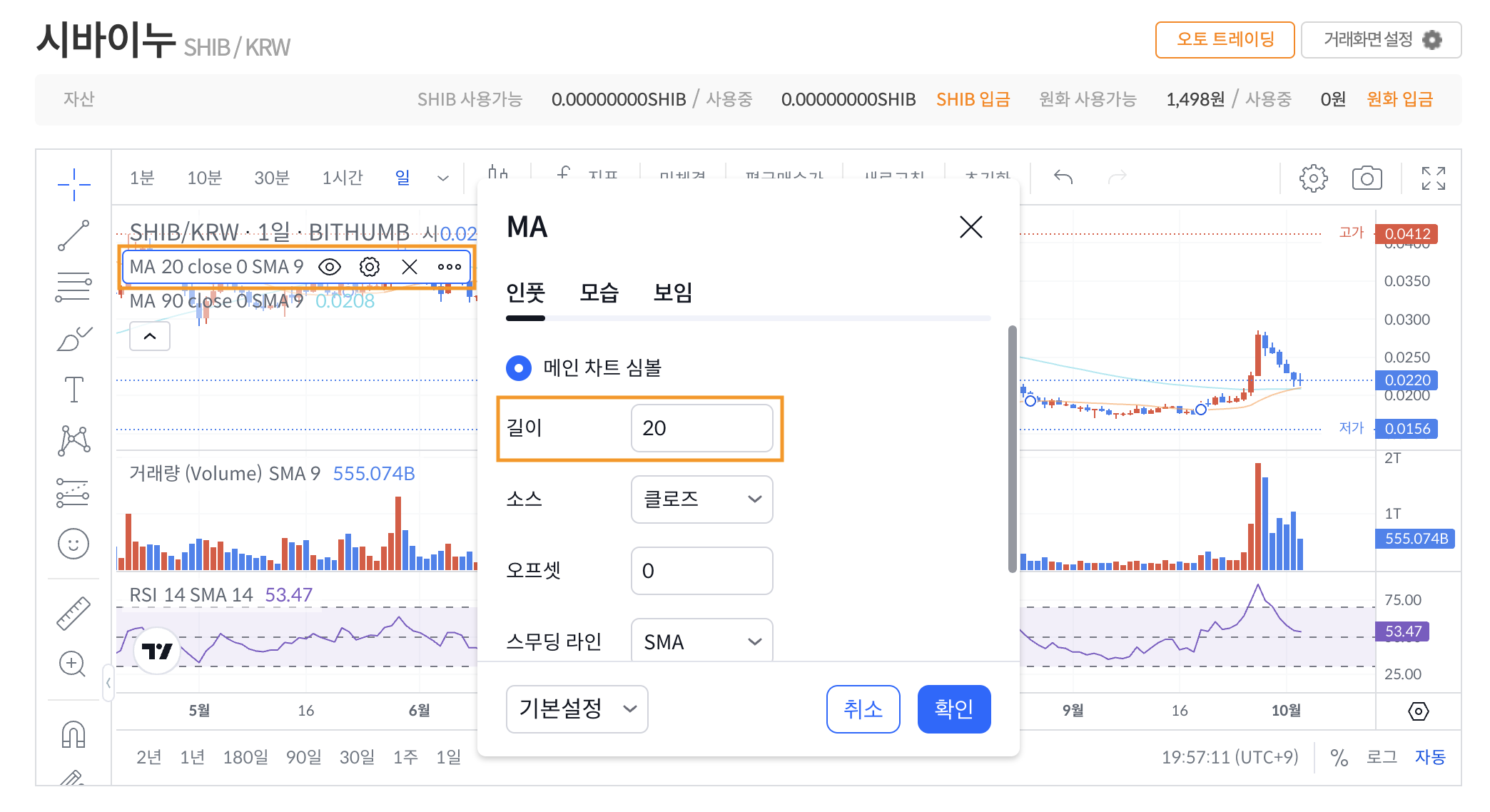 추가하면 9일선이 추가되는데 이를 장기이평선인 220선으로 수정합니다. 90선과 220선은 종목마다 길이를 조금씩 수정하시면서 차트의 지지와 저항이 잘 맞닿는 값으로 설정합니다. 아래의 시바이누에서는 90선과 220선이 지지와 저항이 잘 맞는것을 볼 수 있습니다.