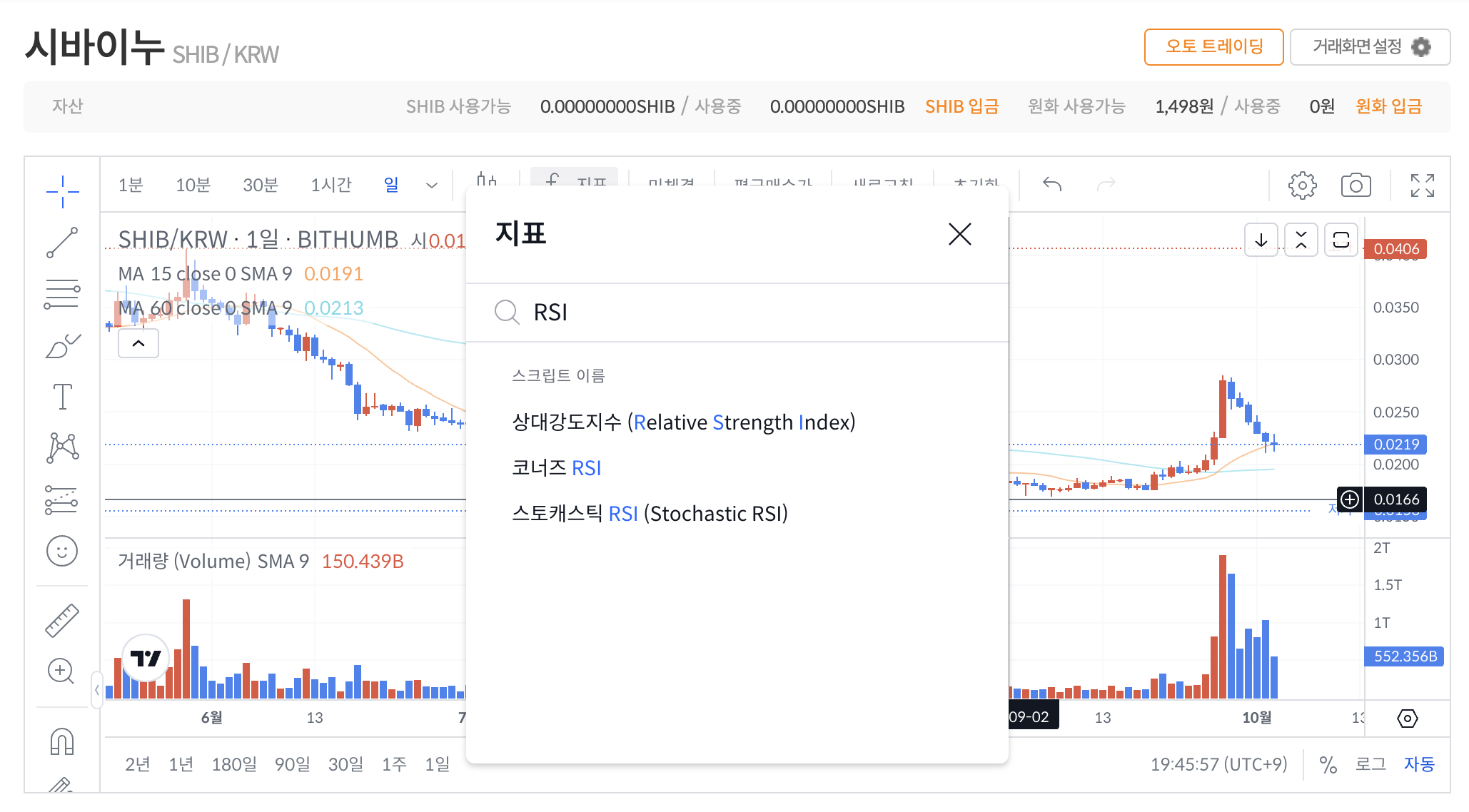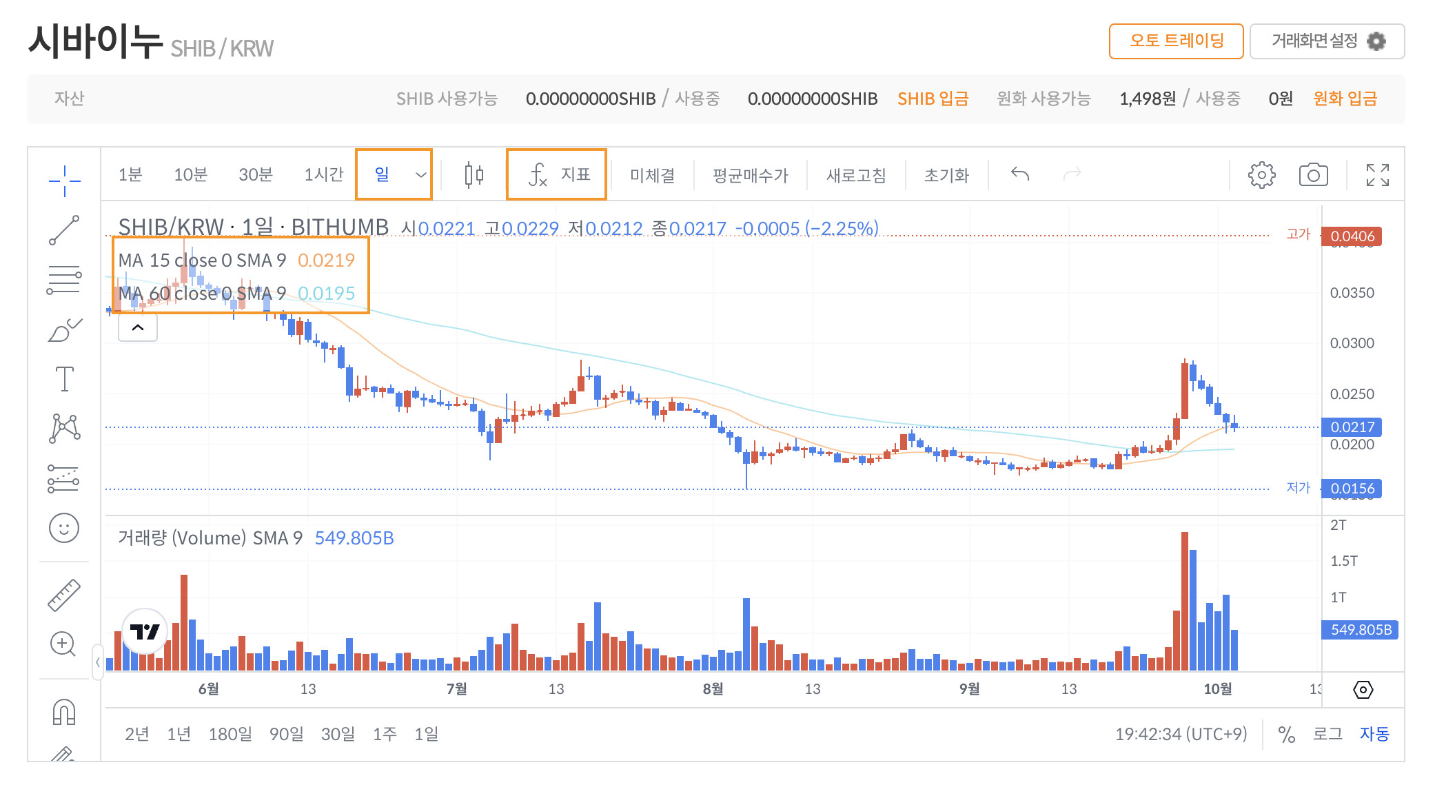 초기화면은 아래와 같은데 이동평균선은 15선과 60선이 설정되어 있고, 거래량 지표가 표시되어 있습니다.
